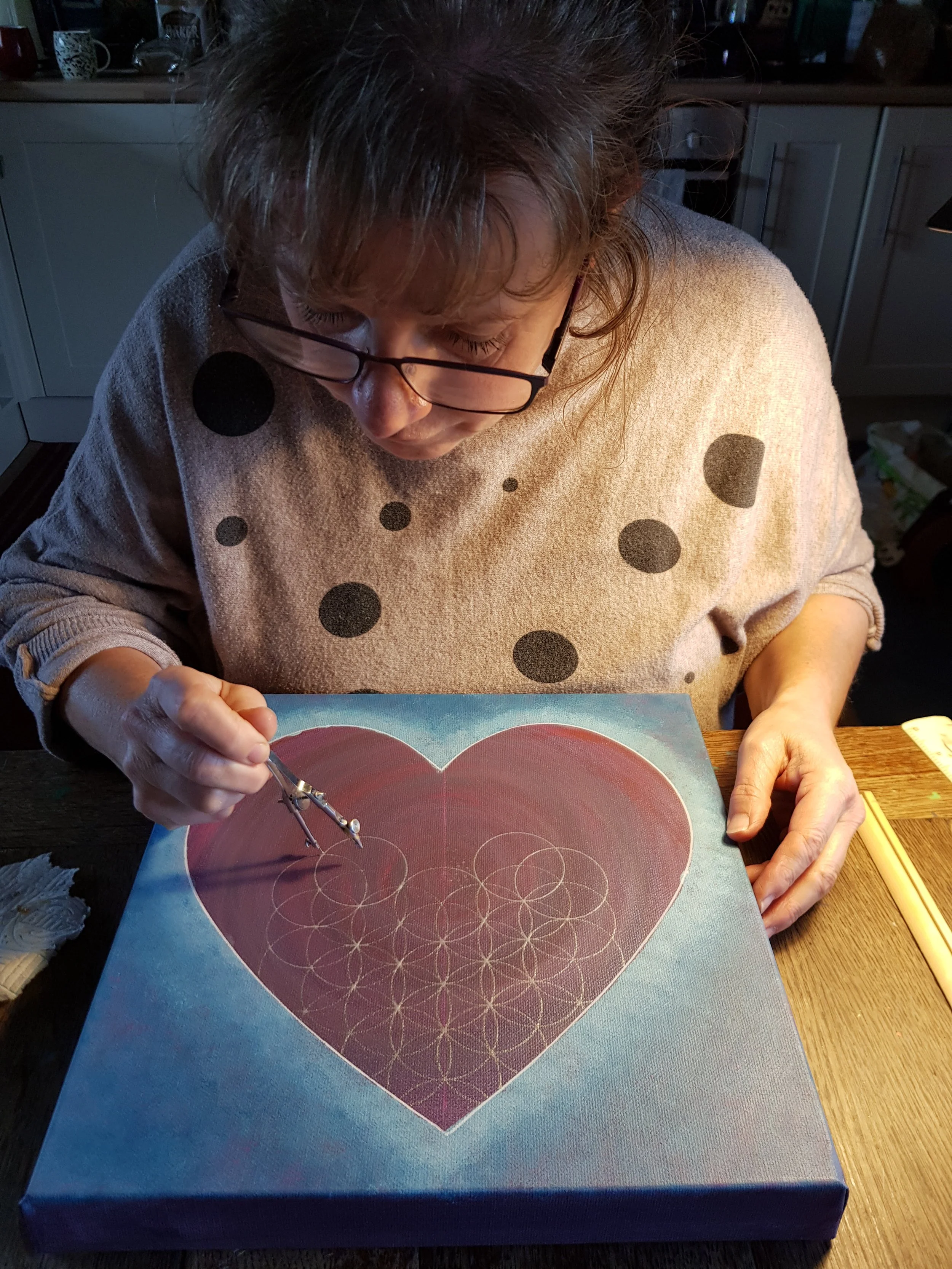 I spent many years working as a cartographer and developed a steady hand and a love of fine lines which has been very helpful for my illustrations and also for creating the sacred geometry on my canvases.